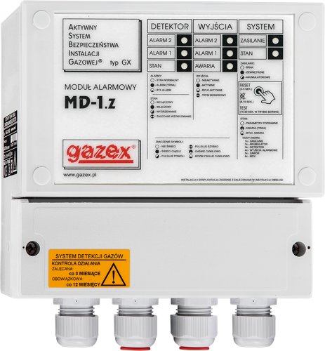 الوحدات في الإصدار MD…Z يمكن أن تتحكم في صمام إغلاق الغاز. هذه الوحدة هي جزء من "نظام الإشارة وإيقاف الغاز" وفقًا لمتطلبات وزير البنية التحتية في جمهورية بولندا بتاريخ 12 إبريل 2002 بشأن الشروط التقنية التي يجب توفرها في المباني ومواقعها (جريدة القوانين 2002 العدد 75 + التغييرات).